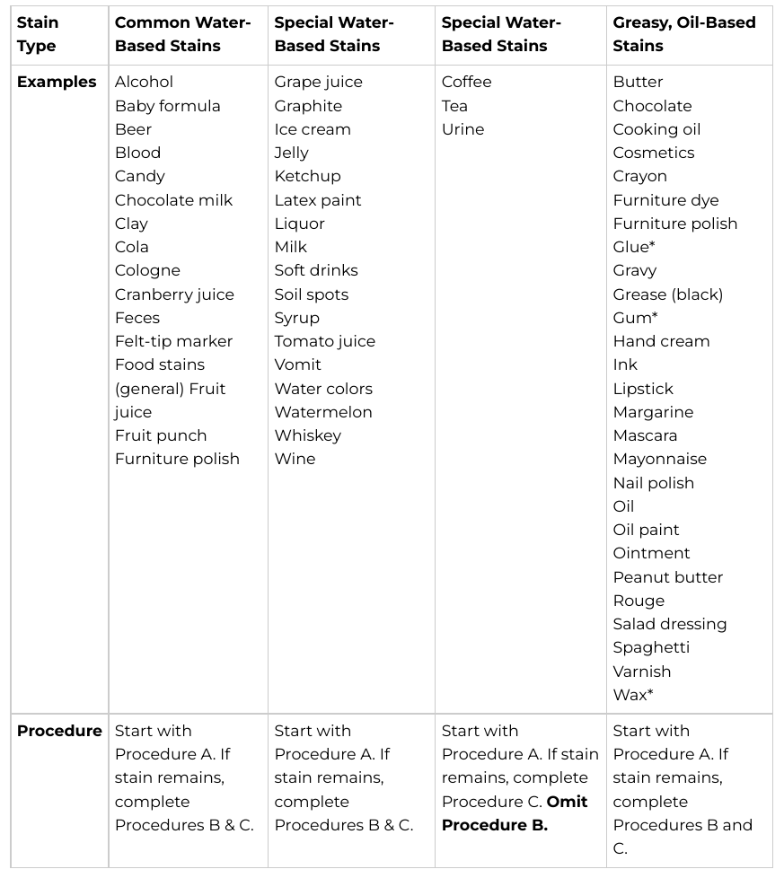 Now it’s time to locate your stain on this handy Common Stains Chart. Different stains require slightly different removal procedures, each fine-tuned to keep your carpet pile dazzling. Procedures A, B & C are designed to do just that, but first- identify your mess-maker!